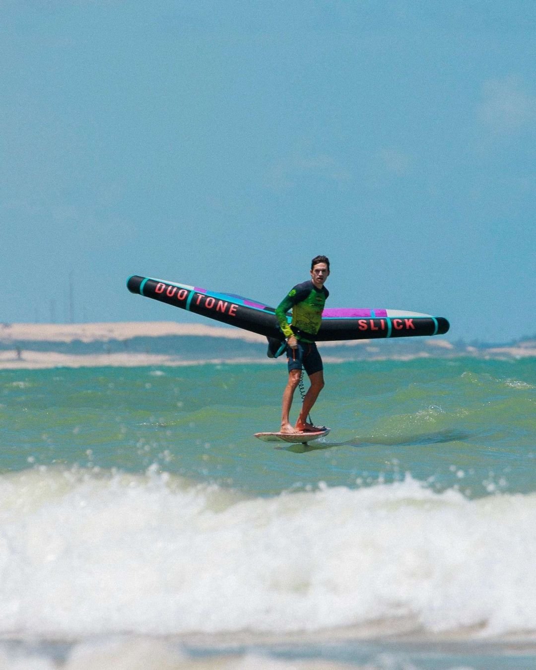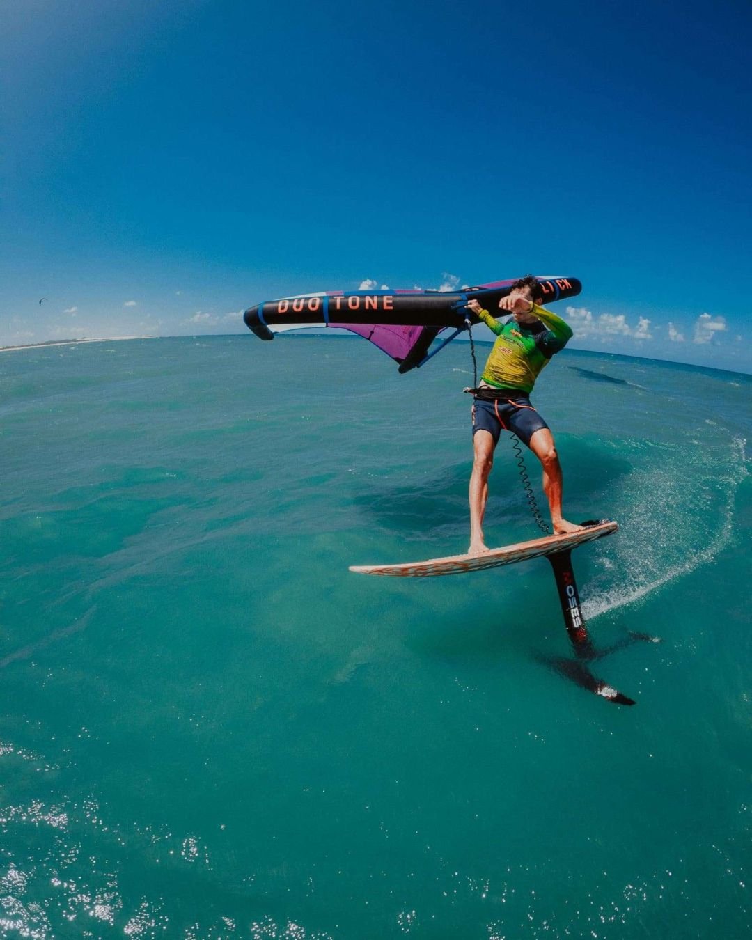 Ao contratar o pacote Areia, Céu e Mar, eu também levo o drone para fotos áreas do seu velejo.